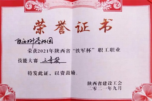 經(jīng)過激烈角逐,陜西日升建筑勞務(wù)有限責(zé)任公司代表隊李環(huán)國憑借其個人出色的技藝榮獲2021年陜西省“鐵軍杯”職工職業(yè)技能大賽“三等獎”!