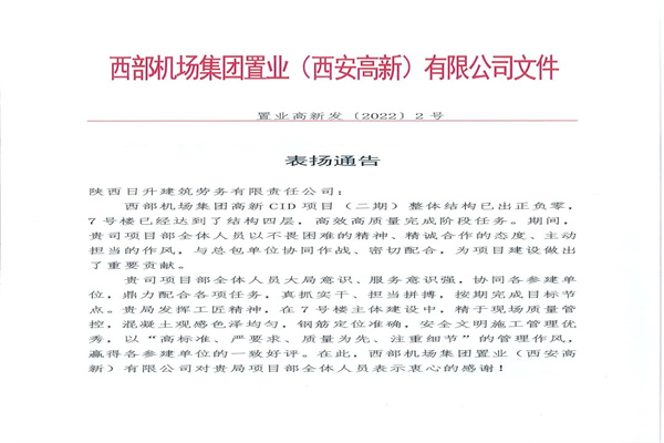 西部機(jī)場(chǎng)集團(tuán)置業(yè)(西安高新)有限公司表?yè)P(yáng)信