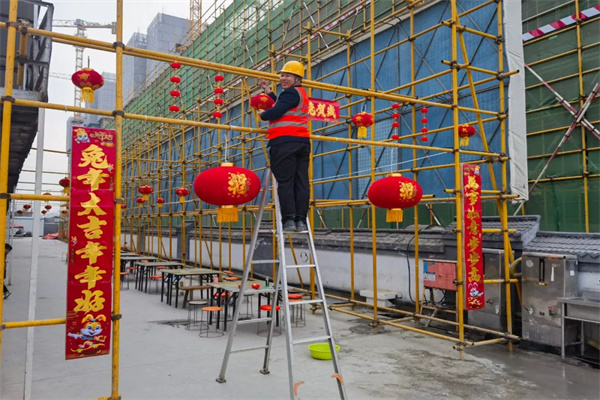 玉兔迎新,萬象更新,1月21日,農(nóng)歷大年三十,在這個萬家團圓、舉國歡慶的日子,為保障工程建設(shè)進度臻誠實業(yè)集團多個項目不停工,建設(shè)者們毅然選擇堅守崗位一線,為了讓大家在項目上也能過好年公司精心安排了項目團圓飯,現(xiàn)在,小編帶您一起走進菁英公寓公租房項目的年夜飯現(xiàn)場,大家貼對聯(lián)、掛燈籠、包餃子、拜新年……在紅紅火火的氛圍里,體驗不一樣的年味,感受家一樣的溫暖。